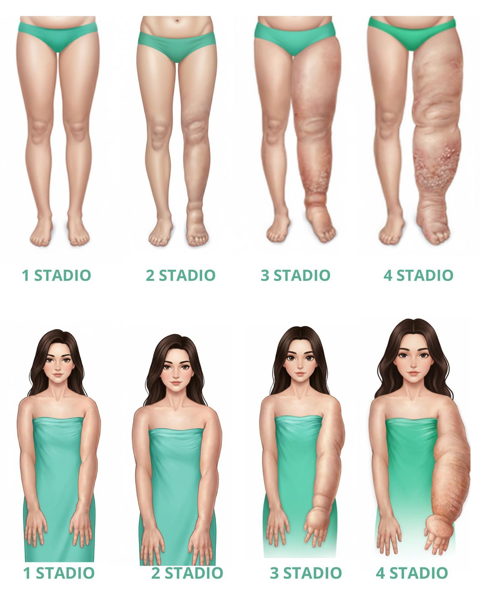 Il linfedema evolve progressivamente nel tempo e viene generalmente classificato in quattro stadi, in base alla gravità dei sintomi e alle modificazioni dei tessuti.